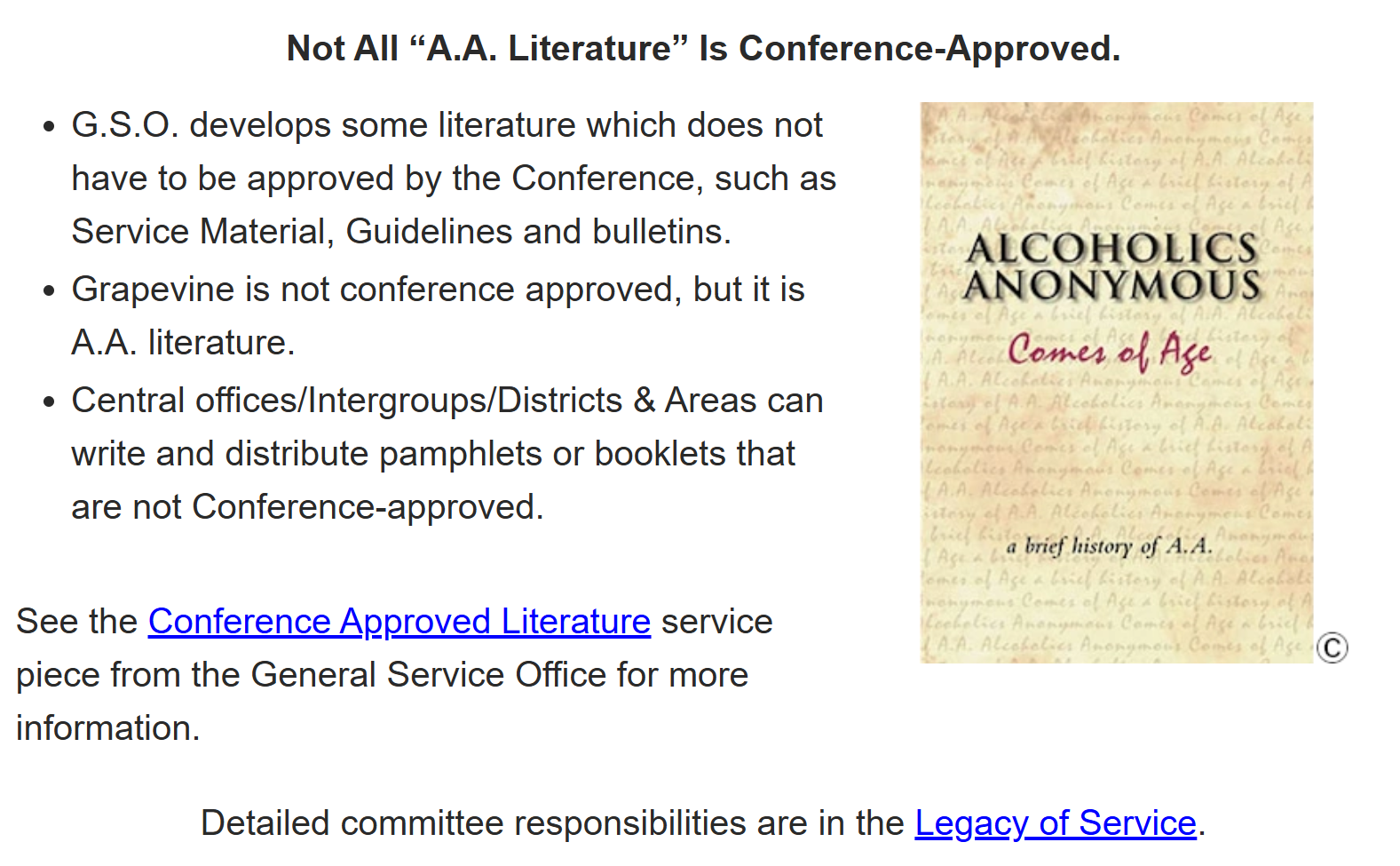 Ensure an ample supply of current General Service Conference-approved literature (pamphlets, books, audiovisual, etc.)